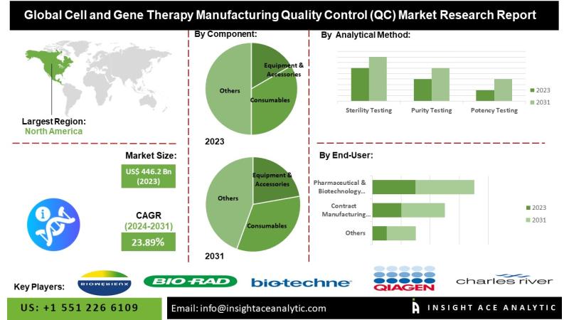 InsightAce Analytic Pvt. Ltd. announces the release of a market assessment report on the "Global Cell and Gene Therapy Manufacturing Quality Control (QC) Market - (By Component (Equipment & Accessories, Consumables, Others), By Application (Sterility Testing, Purity Testing, Potency Testing, Identity Testing, Others (stability, viability, etc.)), By Process (Upstream Processing, Downstream Processing, Packaging), By End-User (Pharmaceutical & Biotechnology Companies, Contract Manufacturing Organizations)), Trends, Industry Competition Analysis, Revenue and Forecast To…