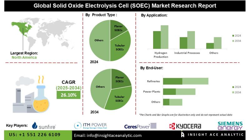 InsightAce Analytic Pvt. Ltd. announces the release of a market assessment report on the "Global Solid Oxide Electrolysis Cell (SOEC) Market- (By Product Type (Planar SOECs, Tubular SOECs), By Application (Hydrogen Production, Industrial Processes, Others), By End-User (Power Plants, Refineries, Chemical Industries, Others)), Trends, Industry Competition Analysis, Revenue and Forecast To 2034."