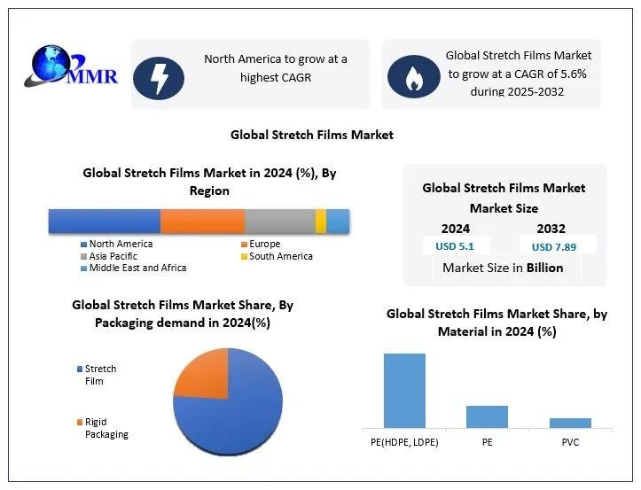 Stretch Films Market size was valued at USD 5.1 Bn. in 2024 and the total Global Stretch Films Market revenue is expected to grow at a CAGR of 5.6% from 2025 to 2032, reaching nearly USD 7.89 Bn. by 2032.