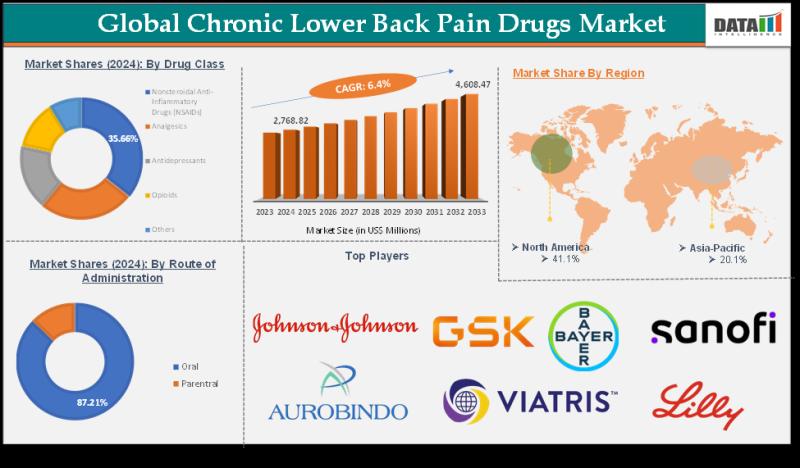 The Chronic Lower Back Pain Drugs Market size reached US$ 2,768.82 million in 2024 and is expected to reach US$ 4,608.47 million by 2033, growing at a CAGR of 6.4% during the forecast period of 2025-2033.
