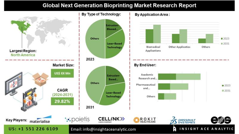 InsightAce Analytic Pvt. Ltd. has announced the publication of a market research report titled "Global Next Generation Bioprinting Market (Type of Technology (Extrusion-based Technology, Laser-based Technology, Inkjet-based Technology, Others), Application Area (Biomedical Applications, Other Applications), End-user (Pharmaceutical and Biotechnology Companies, Academic Research and Development, Other End-users))- Market Outlook and Industry Analysis 2031"According to company's newest research, the Global Next Generation Bioprinting Market is predicted to witness a promising CAGR of 29.57% during the forecast period 2023-2031.