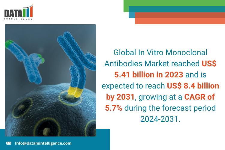 Global In Vitro Monoclonal Antibodies Market reached US$ 5.41 billion in 2023 and is expected to reach US$ 8.4 billion by 2031, growing at a CAGR of 5.7% during the forecast period 2024-2031.