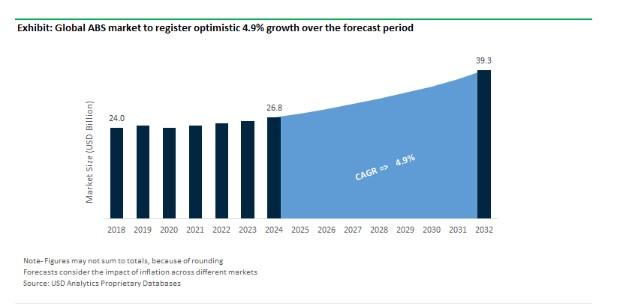 USD Analytics forecasts the global Acrylonitrile Butadiene Styrene market size to increase from $26.8 Billion in 2024 to $39.3 Billion in 2032, registering a CAGR of 4.9% during the forecast period.