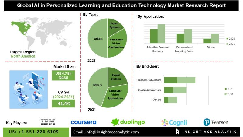 InsightAce Analytic Pvt. Ltd. announces the release of a market assessment report on the "Global AI in Personalized Learning and Education Technology Market - (By Type (Machine Learning Algorithms, Natural Language Processing (NLP) Systems, Expert Systems, Computer Vision Applications, Intelligent Tutoring Systems (ITS), Virtual Learning Environments (VLEs), Adaptive Learning Platforms), By Application (Adaptive Content Delivery, Personalized Learning Paths, Individualized Assessment and Feedback, Intelligent Content Creation, Smart Content Recommendations, Personalized Learning…