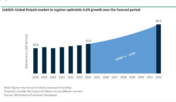 USD Analytics forecasts the global Polyols market size to increase from $41.6 Billion in 2024 to $69.4 Billion in 2032, registering a CAGR of 6.6% during the forecast period