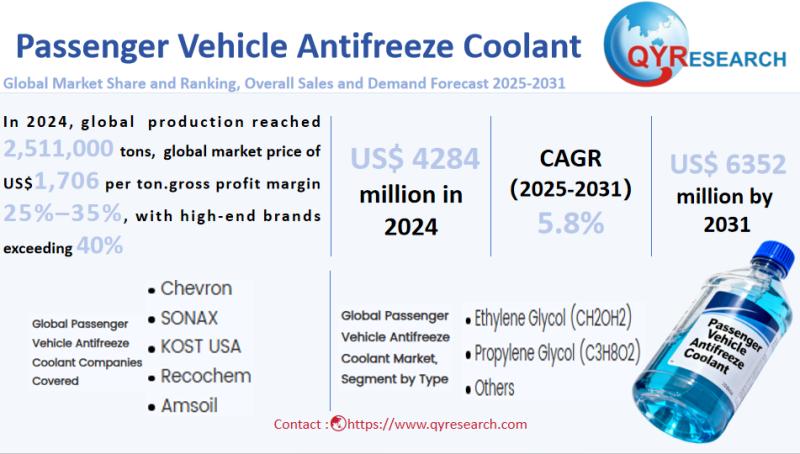 Global leading market research publisher QYResearch published the release of its latest report, "Passenger Vehicle Antifreeze Coolant - Global Market Share, Ranking, Sales, and Demand Forecast 2025-2031". This in-depth report provides a complete analysis of the global Passenger Vehicle Antifreeze Coolant market, offering critical insights into market size, share, demand, industry development status, and future forecasts.…