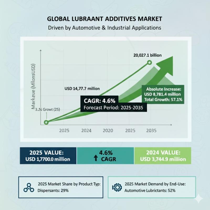 The global lubricant additives market is poised for steady expansion through 2035, propelled by stricter emission regulations, the rise of electric and hybrid vehicles, and demand for sustainable, high-performance formulations. According to Future Market Insights (FMI), the market is valued at USD 14.7 billion in 2025 and is projected to hit USD 23.1 billion by 2035, growing at a compound annual growth rate (CAGR) of 4.6%.