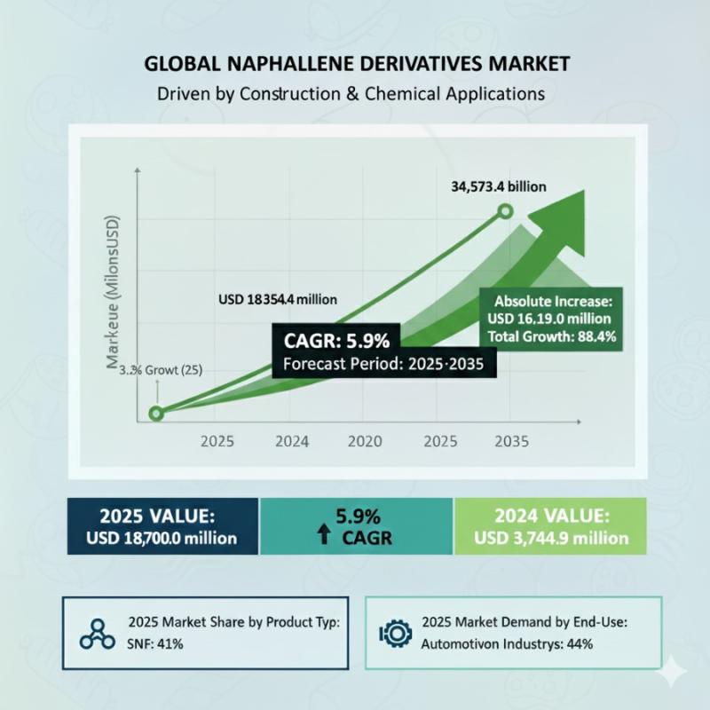 The global naphthalene derivatives market is set for robust expansion through 2035, fueled by infrastructure megaprojects, high-performance concrete demand, and agrochemical innovation. According to Future Market Insights (FMI), the market is valued at USD 18,354.4 million in 2025 and is projected to reach USD 34,573.4 million by 2035, advancing at a compound annual growth rate (CAGR) of 5.9%.