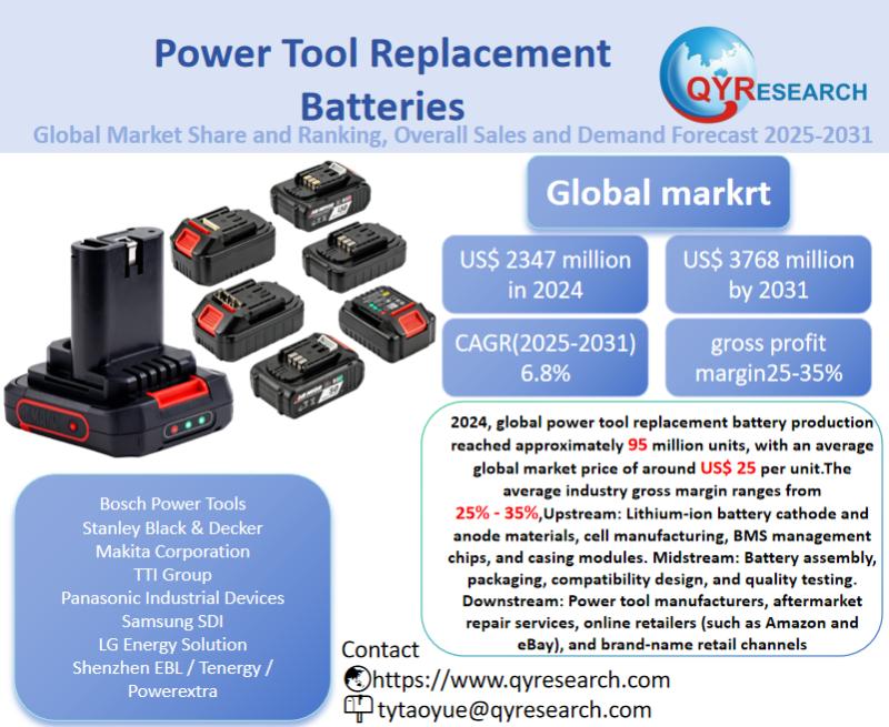 Global leading market research publisher QYResearch published the release of its latest report, "Power Tool Replacement Batteries - Global Market Share, Ranking, Sales, and Demand Forecast 2025-2031". This in-depth report provides a complete analysis of the global Power Tool Replacement Batteries market, offering critical insights into market size, share, demand, industry development status, and future forecasts.…