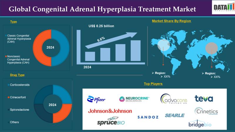 The Global Congenital Adrenal Hyperplasia Treatment Market reached US$ 0.25 billion in 2024 and is expected to reach US$ 0.41 billion by 2033, growing at a CAGR of 6.6% during the forecast period 2025-2033. According to DataM Intelligence Comprehensive Report has released its latest report on the "Congenital Adrenal Hyperplasia Treatment Market Size 2025," providing a detailed analysis of market trends, key growth drivers, competitive landscape, and regional insights. The report