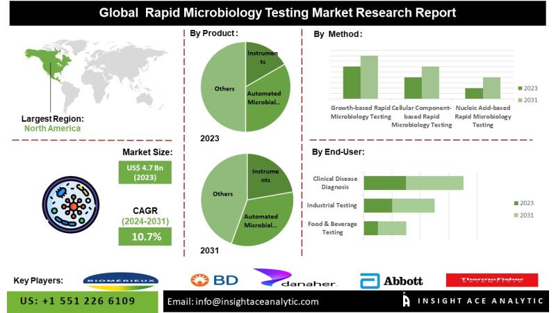 InsightAce Analytic Pvt. Ltd. announces the release of a market assessment report on the "Global Rapid Microbiology Testing Market- (By Product (Instruments, Reagent& Kits, Consumables), Method (Growth, Nucleic Acid, Cellular Component, Viability and Others), Application (Clinical Disease Diagnosis, Industrial Testing, Research)), By Region, Trends, Industry Competition Analysis, Revenue and Forecast To 2031."According to the latest research by InsightAce Analytic, the Global Rapid Microbiology Testing Market is valued at US$ 4.7 Bn in 2023, and it is expected to reach US$ 10.4 Bn by 2031, with a CAGR of 10.7% during the forecast period of 2024-2031.
