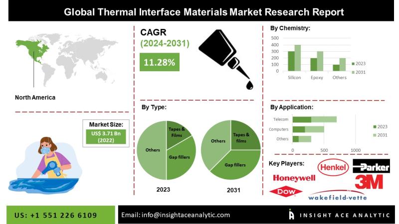 InsightAce Analytic Pvt. Ltd. announces the release of a market assessment report on the "Global Thermal Interface Material Market Size, Share & Trends Analysis Report By Chemistry (Silicone, Epoxy And Polyimide), Type (Greases & Adhesives, Taps & Films, And Gap Fillers), And Application (Computers, Telecom, Consumer, Durables, And Medical Devices Based On The Applications)- Market Outlook And Industry Analysis 2031"The global thermal interface material market is estimated to reach over USD 8.61 billion by 2031, exhibiting a CAGR of 11.28% during the forecast period.