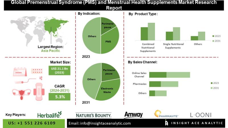 InsightAce Analytic Pvt. Ltd. announces the release of a market assessment report on the "Premenstrual Syndrome (PMS) and Menstrual Health Supplements Market- (By Product Type (Combined Nutritional Supplements, Single Nutritional Supplements), By Type Indication (Perimenopause, PMS), By Formulation (Capsules/Tablets, Powder, Softgels, Other), By Sales Channel (Pharmacies/Drug Stores, Online Sales Channel, Direct Sales Channel, Others)), By Region, Trends, Industry Competition Analysis, Revenue and Forecast To 2031."