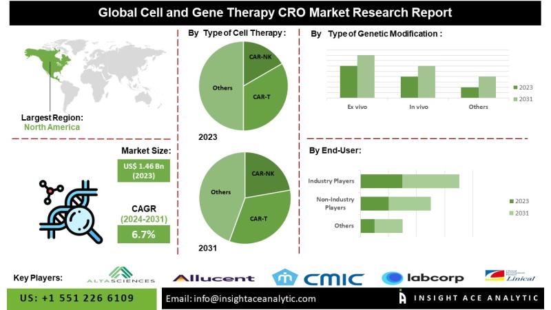 InsightAce Analytic Pvt. Ltd. announces the release of a market assessment report on the "Global Cell and Gene Therapy CRO Market- (By Type of Cell Therapy (CAR-NK, CAR-T, TCR-T, and Others), By Type of Genetic Modification (Ex vivo and In vivo), By Stage of Development (Discovery, Preclinical, and Clinical)), By Therapeutic Area, By End-user, By Region, Trends, Industry Competition Analysis, Revenue and Forecast To 2031."