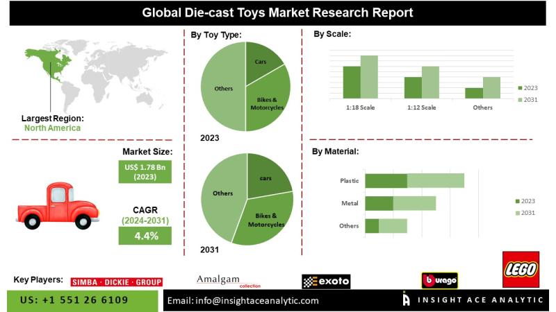InsightAce Analytic Pvt. Ltd. announces the release of a market assessment report on the "Global Die-cast Toys Market - (By Toys Type (Cars (Road Cars, Sports Cars, Super Cars, Formula 1 Cars, Others (Vintage Cars, Police Cars, Etc.), Bikes & Motorcycles (Sport Bikes, Cruiser Bikes, Chopper Bikes, Touring Bikes, Others (Dirt Bikes, Vintage Bikes, Etc.))), By Scale (1:18 Scale, 1:12 Scale, 1:43 Scale, 1:64 Scale, 1:87 Scale), By Material (Metal,…