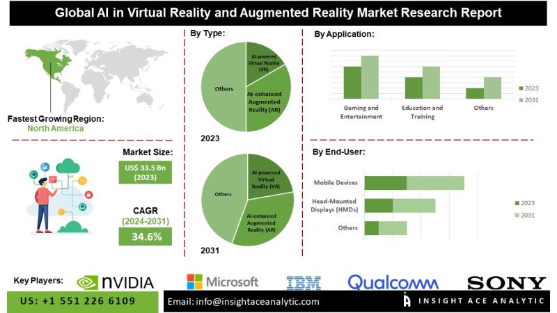 InsightAce Analytic Pvt. Ltd. announces the release of a market assessment report on the "Global AI in Virtual Reality and Augmented Reality Market - (By Type (AI-powered Virtual Reality (VR), AI-enhanced Augmented Reality (AR)), By Application (Gaming and Entertainment, Education and Training, Healthcare and Medical, Retail and E-commerce, Real Estate and Architecture, Automotive and Transportation, Tourism and Travel, Social Media and Communication, Industrial and Manufacturing, Military and Defense), By Technology…