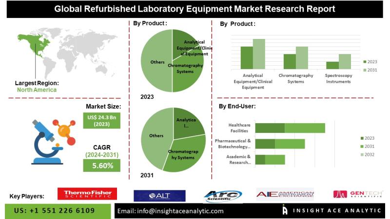 "Global Refurbished Laboratory Equipment Market - (By Product (Analytical Equipment (Chromatography Systems, Spectroscopy Instruments, Mass Spectrometers, Thermal Analyzers, Immunoassay Analyzers, Blood Gas Analyzers, Coagulation Analyzers, Others (elemental analyzers, particle size analyzers, etc.)), General Equipment (Centrifuges, Incubators, Ovens, Autoclaves, Safety cabinets, Others (balances & scales, shakers & stirrers, etc.)), Specialty Equipment (DNA Sequencers (PCR Instruments, Flow Cytometers, Microscopes, Bioreactors, Others (microplate readers, x-ray diffraction systems, etc.,)), Support Equipment), By End-User (Healthcare…