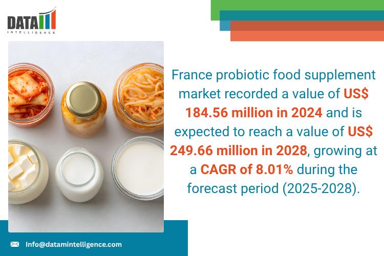 France probiotic food supplement market recorded a value of US$ 184.56 million in 2024 and is expected to reach a value of US$ 249.66 million in 2028, growing at a CAGR of 8.01% during the forecast period (2025-2028).