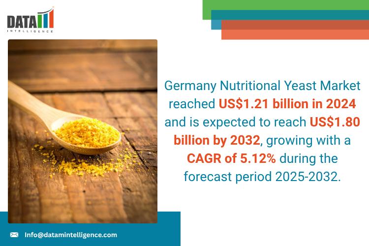 Germany Nutritional Yeast Market reached US$1.21 billion in 2024 and is expected to reach US$1.80 billion by 2032, growing with a CAGR of 5.12% during the forecast period 2025-2032.