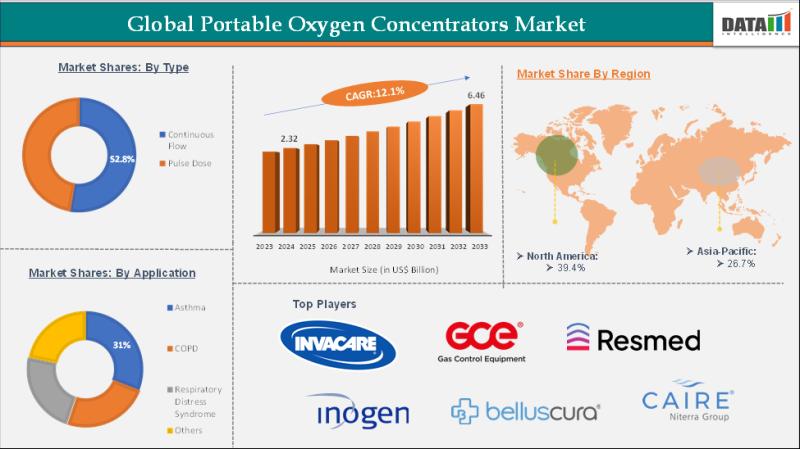 The Portable Oxygen Concentrators Market reached US$ 2.32 billion in 2024 and is expected to reach US$ 6.46 billion by 2033, growing at a CAGR of 12.1% during the forecast period 2025-2033.