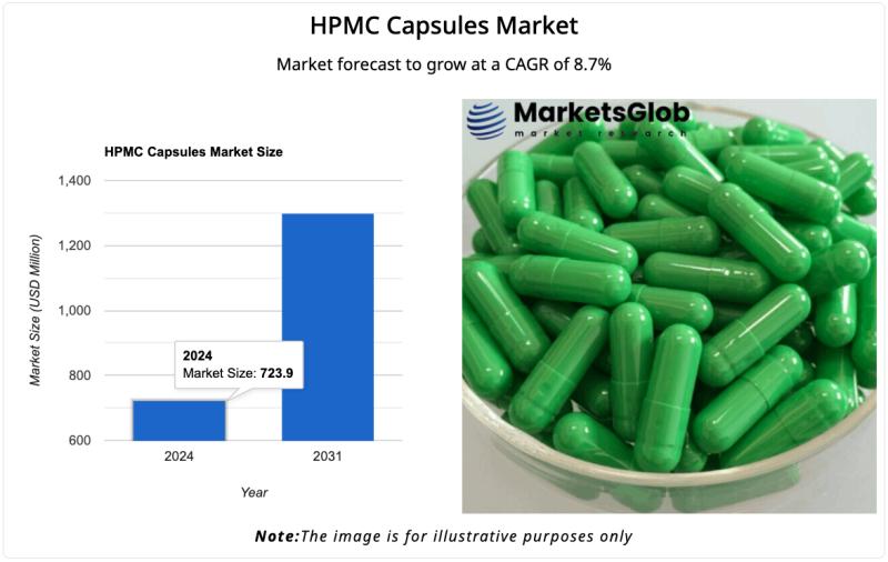 The global HPMC Capsules Market size reached 723.9 USD Million in 2024. Looking forward, MarketsGlob expects the market to reach 1,298.03 USD Million by 2031, exhibiting a growth rate (CAGR) of 8.7% during 2025-2031.A recent report published by MarketsGlob offers an in-depth analysis of the Global HPMC Capsules Market, projecting trends and market size through 2031. This comprehensive study serves as a valuable reference for industry professionals, including executives, analysts, and decision-makers. It provides quick and easy access to crucial insights on market dynamics, key growth factors, potential opportunities, and challenges ahead. Additionally, the report sheds light on the competitive landscape, helping stakeholders stay informed and make strategic decisions.