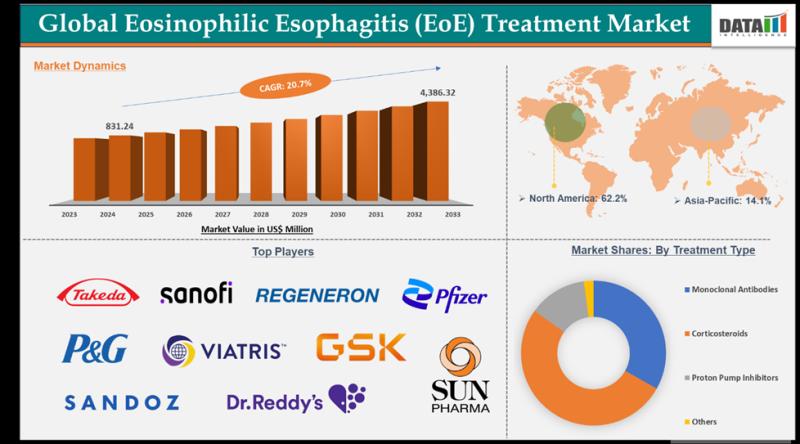 Eosinophilic Esophagitis (EoE) Treatment Market reached US$ 831.24 million in 2024 and is expected to reach US$ 4,386.32 million by 2033, growing at a CAGR of 20.7% during the forecast period 2025-2033.