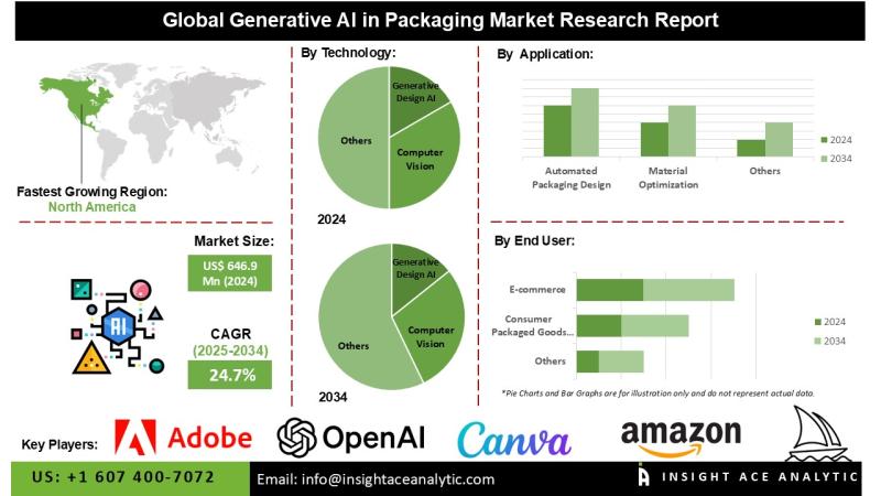InsightAce Analytic Pvt. Ltd. announces the release of a market assessment report on the " Generative AI in Packaging Market- (By Deployment Mode (Cloud-Based, On-Premises), By Technology (Generative Design AI, Natural Language Processing (NLP), Computer Vision, AI-powered Simulation and Testing), By Application (Material Optimization, Automated Packaging Design, Predictive Maintenance and Quality Control, Personalization and Segmentation of One, Supply Chain and Logistics Optimization), By End-User (E-commerce, Consumer Packaged Goods (CPG), Pharmaceuticals, Food and Beverage, Cosmetics and Personal Care)), Trends, Industry Competition Analysis, Revenue and Forecast To 2034."According to the latest research by InsightAce Analytic, the Generative AI in Packaging Market is valued at USD 646.9 Mn in 2024 , and it is expected to reach USD 5,813.2 Mn by the year 2034, with a CAGR of 24.7% during the forecast period of 2025-2034.
