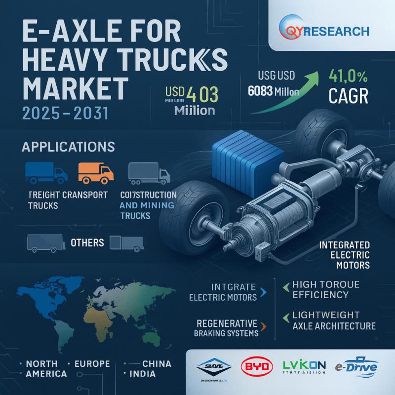 Los Angeles, United States - QY Research has released a new publication titled "Global E-Axle for Heavy Trucks Market Share and Ranking, Overall Sales and Demand Forecast 2025-2031." This comprehensive study provides an in-depth evaluation of the worldwide E-Axle for Heavy Trucks industry, uncovering the major forces influencing market growth and delivering high-value insights for investors, industry leaders, and strategic decision-makers. The report examines critical elements such as market dynamics,…