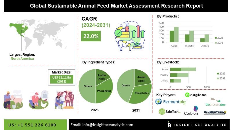 InsightAce Analytic Pvt. Ltd. announces the release of a market assessment report on the "Global Sustainable Animal Feed Market- by Ingredient Types (Amino Acids, Phosphates, Vitamins, Acidifiers, Carotenoids, Enzymes, Mycotoxin Detoxifiers, Flavors & Sweeteners, Antibiotics, Minerals, Antioxidants, Non-protein Nitrogen, Phytogenics, Preservatives, and Probiotics), Products (Algae, Insect, and Single-Cell Protein), Livestock (Poultry, Ruminants, Swine, Aquatic Animals, and Other Livestock (Equine and Pet food)), Trends, Industry Competition Analysis, Revenue and Forecast To 2034."According to the latest research by InsightAce Analytic, the global Sustainable Animal Feed market was valued at USD 18.2 Billion in 2024, and it is expected to reach USD 132.1 Billion by the year 2034, with a CAGR of 22.0% during a forecast period of 2025-2034.