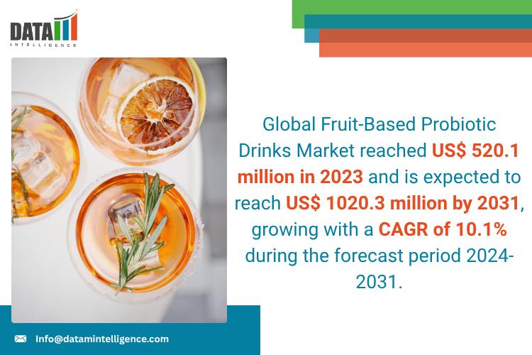 Global Fruit-Based Probiotic Drinks Market reached US$ 520.1 million in 2023 and is expected to reach US$ 1020.3 million by 2031, growing with a CAGR of 10.1% during the forecast period 2024-2031.
