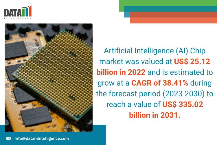 Artificial Intelligence (AI) Chip market was valued at US$ 25.12 billion in 2022 and is estimated to grow at a CAGR of 38.41% during the forecast period (2023-2030) to reach a value of US$ 335.02 billion in 2031