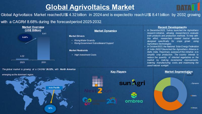 As per DataM Intelligence research report, "Global Agrivoltaics Market reached US$ 4.32 billion in 2024 and is expected to reach US$ 8.41 billion by 2032, growing with a CAGR of 8.68% during the forecast period 2025-2032." Rising demand for sustainable agriculture and renewable energy integration is driving the adoption of agrivoltaics solutions.