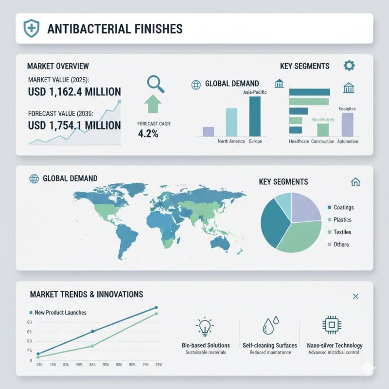 The global Antibacterial Finishes Market is set for sustained expansion over the next decade, driven by a global surge in hygiene awareness and critical demand for advanced infection control solutions across industries. A new market analysis projects the market to climb from USD 1,162.4 million in 2025 to a robust USD 1,754.1 million by 2035, reflecting a steady Compound Annual Growth Rate (CAGR) of 4.2%.