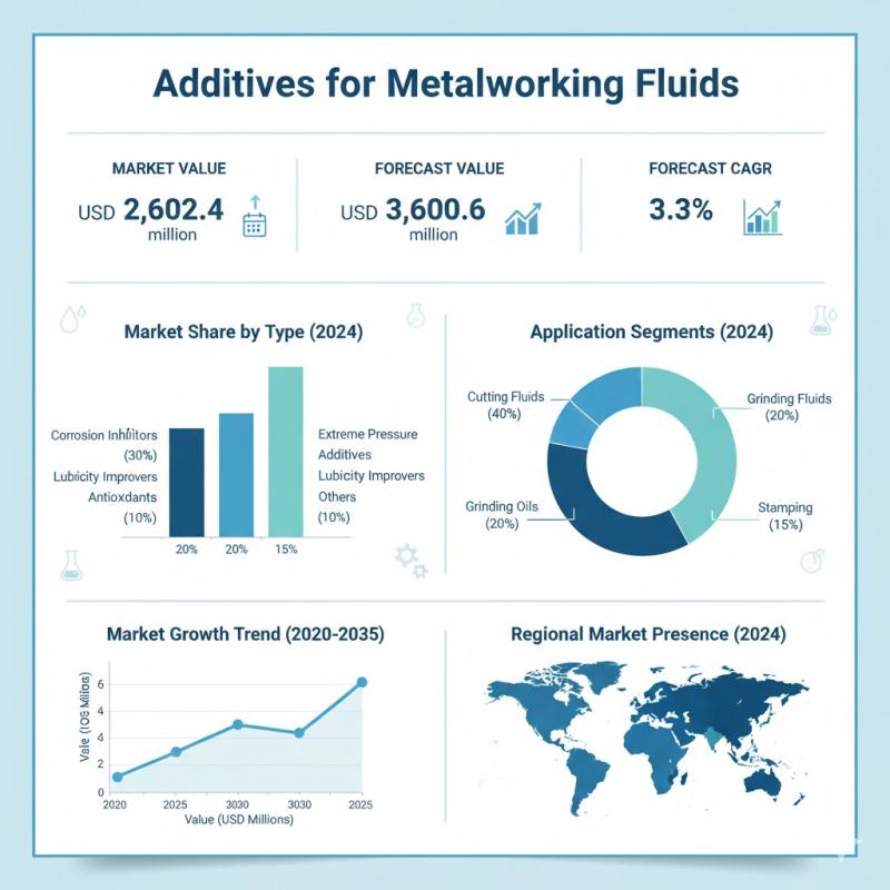 The global market for Additives for Metalworking Fluids is entering a new phase of robust expansion, with its valuation expected to climb from USD 2,602.4 million in 2025 to an impressive USD 3,600.6 million by 2035. This forecast, representing a Compound Annual Growth Rate (CAGR) of 3.3%, underscores the essential role these high-performance chemical components play in modern industrial operations, particularly in sectors like automotive, aerospace, and heavy machinery.