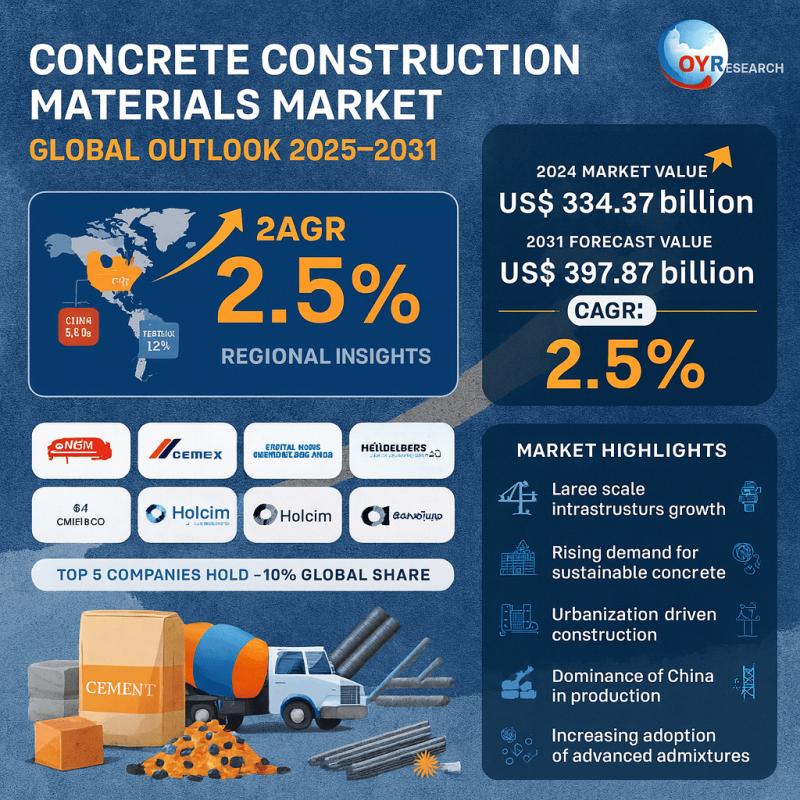 Los Angeles, United States - QY Research has unveiled its latest study titled "Global Concrete Construction Materials Market Share and Ranking, Overall Sales and Demand Forecast 2025-2031." This newly released report delivers a comprehensive overview of the global Concrete Construction Materials market, analyzing the forces shaping its growth trajectory and providing valuable insights for stakeholders, investors, and industry professionals. the research covers key areas including market dynamics, segmentation, regional performance,…