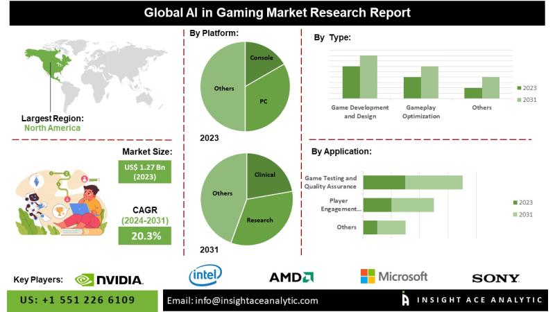 InsightAce Analytic Pvt. Ltd. announces the release of a market assessment report on the "Global AI in Gaming Market - (By Type (Game Development and Design, Gameplay Optimization. Non-Player Character (NPC) Behavior, Virtual Reality (VR) and Augmented Reality (AR) Integration, Natural Language Processing (NLP) for Voice Commands), By Application (Game Testing and Quality Assurance, Player Engagement and Personalization, In-Game Advertising, Virtual Assistant for Players, AI-generated Content Creation), By Game Genre (Action and Adventure, Role-playing games (RPGs), Simulation and Strategy, Sports and Racing, Puzzle and Casual Games), By Platform (Console, PC, Mobile, Cloud Gaming)), Trends, Industry Competition Analysis, Revenue and Forecast To 2034."According to the latest research by InsightAce Analytic, the Global AI in Gaming Market is valued at USD 1.5 Bn in 2024, and it is expected to reach USD 9.8 Bn by the year 2034, with a CAGR of 20.8% during the forecast period of 2025-2034.