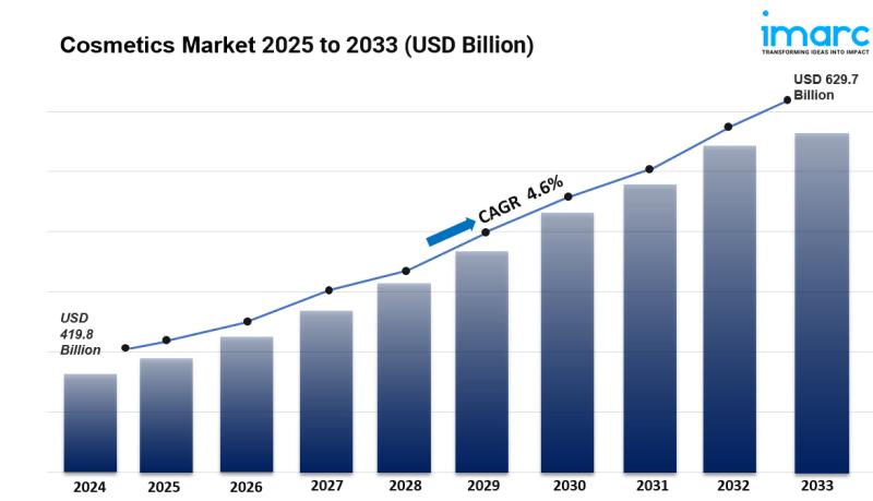 The global Cosmetics Market was valued at USD 419.8 Billion in 2024 and is projected to reach USD 629.7 Billion by 2033, growing at a CAGR of 4.6% during 2025-2033. The market is propelled by growing personal grooming trends, the advent of advanced product variants, rising demand for vegan cosmetics, and expanded product availability on e-commerce platforms.