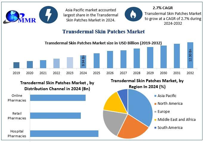 Transdermal Skin Patches Market is expected to reach US$ 12.30 Bn. at a CAGR of 2.7 % during the forecast period 2032.This report provides a thorough examination of the Global Transdermal Skin Patches Market, offering valuable insights for investors, stakeholders, and industry observers. It delves into Market size, segmentation, key drivers and restraints, and emerging trends, providing a clear picture of the industry's current state and future trajectory. Beyond simply stating the factors, this analysis explores how these factors are likely to influence the Market.