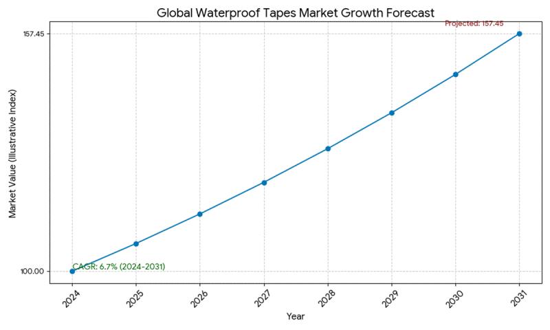 The global Waterproof Tapes Market is expected to grow at a CAGR of 6.7% during the forecast period (2024-2031), driven by rising demand from construction, automotive, and electrical sectors. In 2023, the market was valued at approximately USD 1.7 billion and is projected to reach around USD 2.8 billion by 2031, reflecting steady expansion across both residential and industrial waterproofing applications
