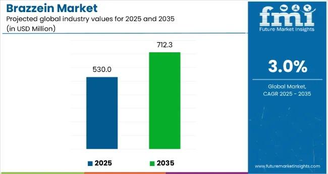 The global brazzein market is projected to grow from USD 530 million in 2025 to USD 712.3 million by 2035, registering a CAGR of 3.0%. The industry stands to gain an absolute dollar opportunity of USD 182.3 million over the forecast period, fueled by accelerating adoption in pharmaceuticals, beverages, bakery, dairy alternatives, and functional foods.