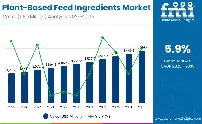 The plant-based feed ingredients market is experiencing robust growth, valued at USD 3,256.8 million in 2025 and projected to reach USD 5,794.7 million by 2035, expanding at a CAGR of 5.9%. The growth is fueled by the rising global demand for sustainable protein sources, enhanced feed efficiency, and the modernization of livestock and poultry production systems.