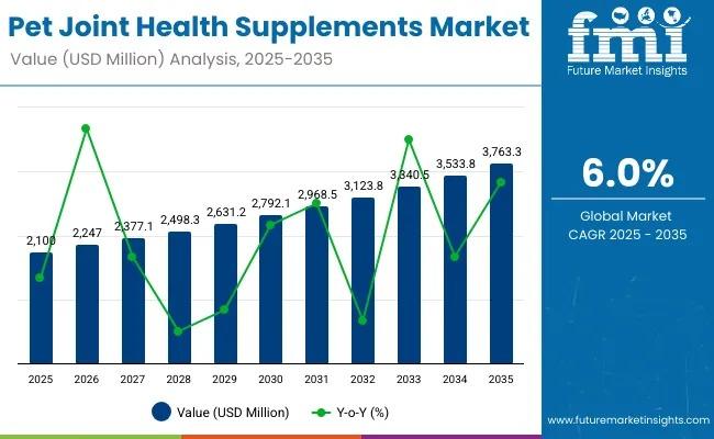 The global pet joint health supplement market is poised for substantial growth, projected to expand from USD 2,100 million in 2025 to approximately USD 3,763.3 million by 2035, registering a 6% CAGR over the forecast period. Rising awareness of preventive care, coupled with the increasing humanization of pets, is fueling demand for advanced joint health solutions designed to maintain mobility and enhance life quality in aging animals.