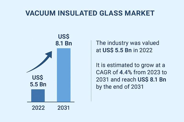 The global Vacuum Insulated Glass (VIG) Market was valued at approximately USD 5.5 billion in 2022 and is projected to reach around USD 8.1 billion by 2031, growing at a CAGR of 4.4% during the forecast period. Market growth is driven by increasing demand for energy-efficient construction, the rise of smart buildings, and expansion in commercial and residential projects worldwide.