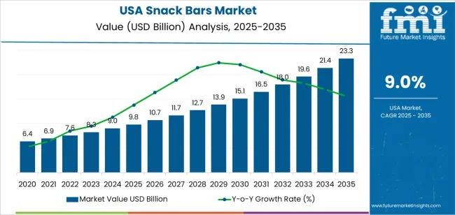 The demand for snack bars in the USA is accelerating, valued at USD 9.8 billion in 2025 and projected to reach USD 23.3 billion by 2035, registering a 9.0% CAGR. This growth reflects rising consumer adoption of portable, portion-controlled foods that support busy schedules and evolving nutritional preferences. As bars become mainstays across supermarkets, convenience stores, and online retail, the category's momentum continues to build nationwide.