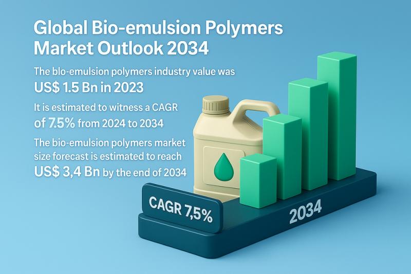 The global bio-emulsion polymers market is entering a decade of strong, innovation-led growth as industries worldwide shift toward sustainable, low-VOC, and bio-based materials. According to the latest market analysis, the bio-emulsion polymers industry valued at US$ 1.5 billion in 2023 is projected to grow at a CAGR of 7.5% between 2024 and 2034, ultimately reaching an estimated US$ 3.4 billion by 2034.