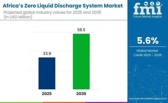 The Africa zero liquid discharge (ZLD) system market is poised for steady expansion through 2035, fueled by tightening environmental regulations, severe water scarcity, and rapid industrialization in mining, power, and chemicals sectors. According to Future Market Insights (FMI), the market is valued at USD 33.9 million in 2025 and is projected to hit USD 58.5 million by 2035, growing at a compound annual growth rate (CAGR) of 5.6%.