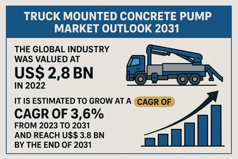The global truck mounted concrete pump market, valued at US$ 2.8 Bn in 2022, is witnessing steady and sustained growth as infrastructure development accelerates across the world. According to market projections, the industry is expected to reach US$ 3.8 Bn by 2031, expanding at a CAGR of 3.6% between 2023 and 2031. This growth is supported by large-scale urbanization, expanded commercial construction, rising investment in megaprojects, and increasing adoption of…